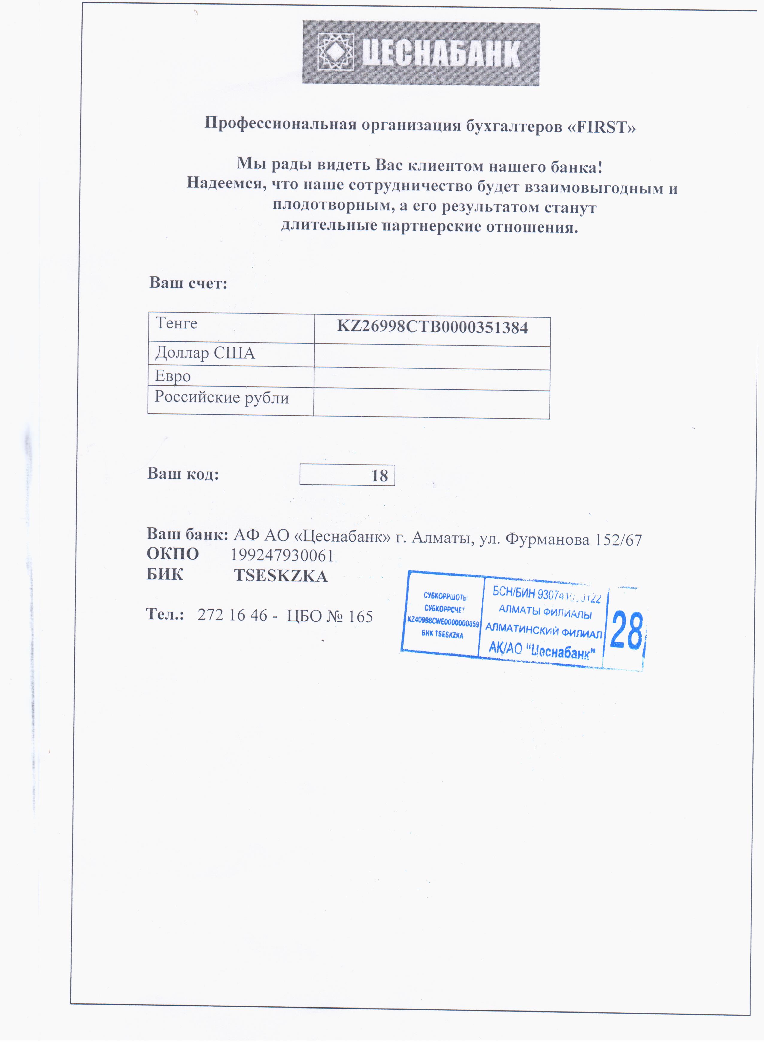 - Для бухгалтерских организаций: копия Устава, копия регистрационного свидетельства (БИН) и копия удостоверения личности руководителя.